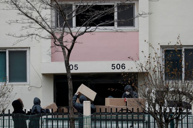 Nhân viên vận chuyển hàng hóa vào khu chung cư bị cách ly tại tâm dịch Daegu. Ảnh: Reuters.