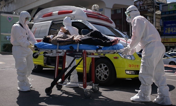 Nhân viên y tế đưa người nghi nhiễm nCoV tới bệnh viện ở Daegu hôm 12/3. Ảnh: AFP.