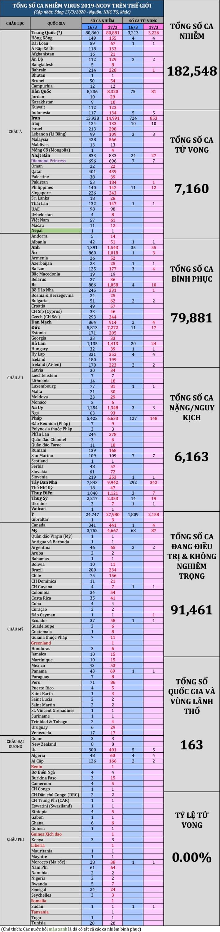 Thế giới 24h qua có thêm 6 quốc gia lần đầu tiên công bố có ca nhiễm viêm phổi Vũ Hán (COVID-19), nâng tổng số quốc gia và vùng lãnh thổ trên thế giới có dịch lên 163 + 1 du thuyền Diamond Princess. Như vậy đã có khoảng 80% số quốc gia trên thế giới có người nhiễm viêm phổi Vũ Hán.