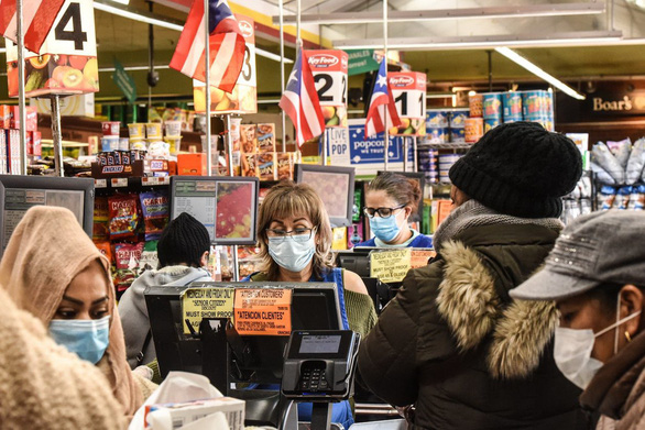 Các nhân viên thu ngân đeo khẩu trang y tế tại một cửa hàng ở quận Brooklyn, thành phố New York - Ảnh: Getty Images