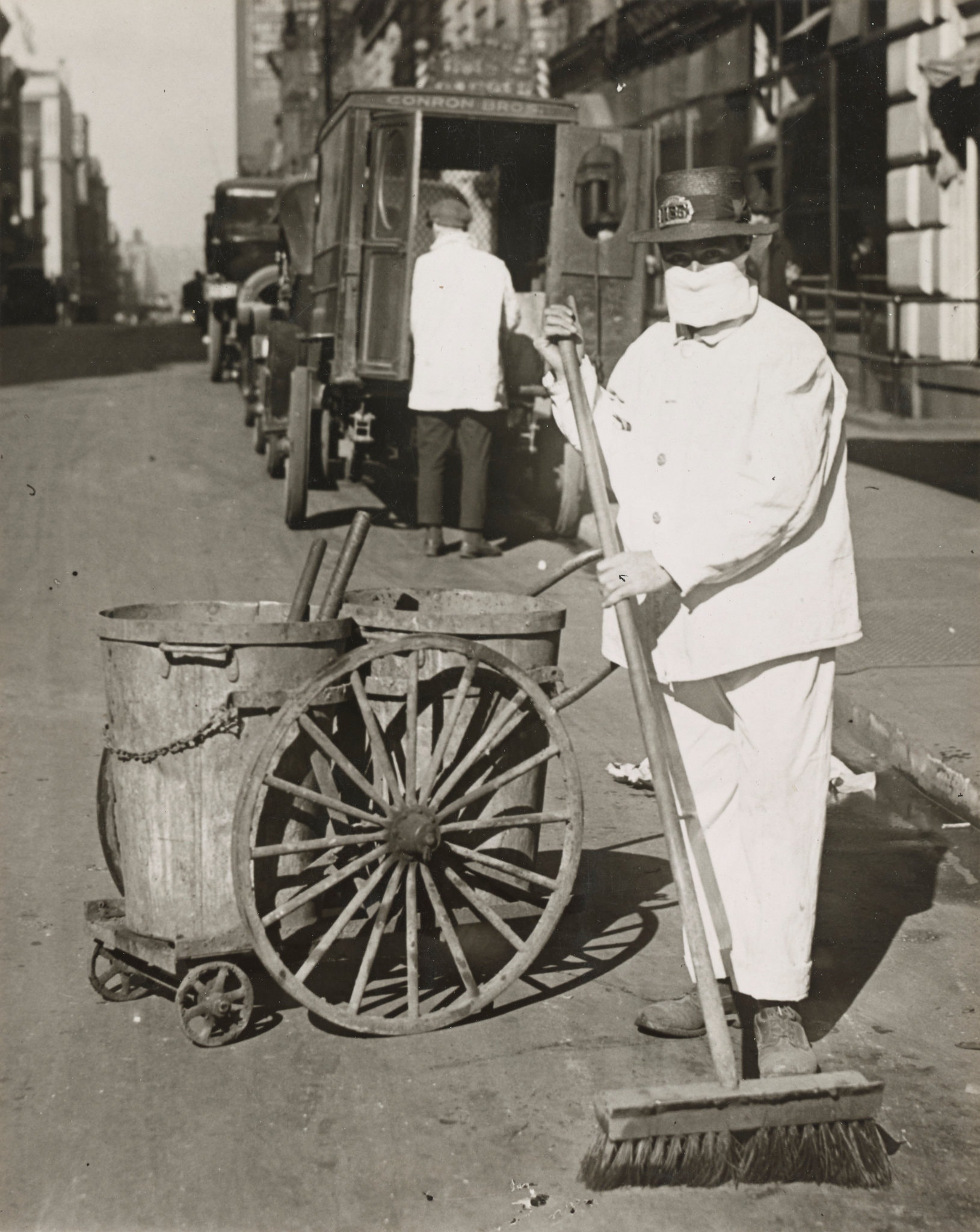 Một người lao công đang che mặt bằng vải trong dịch cúm năm 1918 tại New York (ảnh: NY Times)
