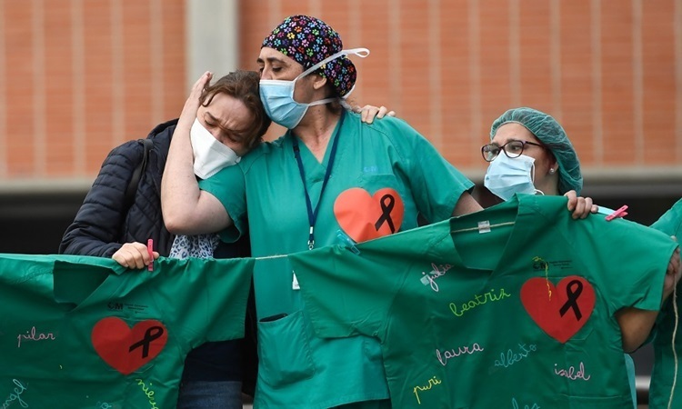 Nhân viên y tế Tây Ban Nha an ủi vợ của một nam y tá tử vong do nCoV tại bệnh viện gần Madrid hôm 10/4. Ảnh: AFP.