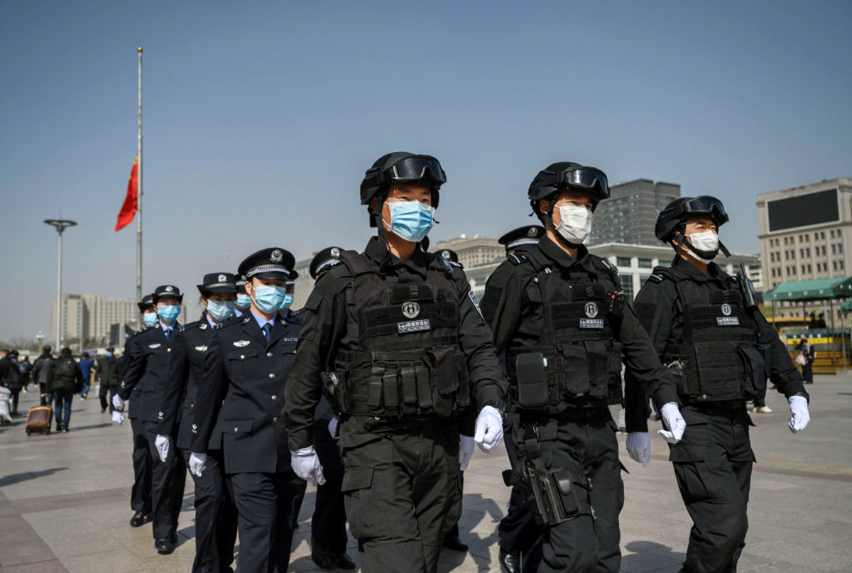 Cảnh sát Trung Quốc đeo khẩu trang diễu hành trong ngày quốc tang tưởng nhớ các nạn nhân của dịch viêm phổi Vũ Hán tại Ga Bắc Kinh ở Bắc Kinh vào ngày 4/4. (Ảnh: Getty Images)
