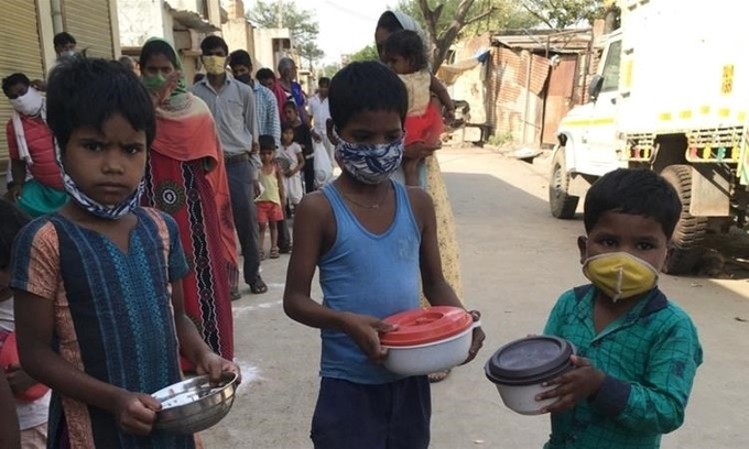 Trẻ em xếp hàng nhận gạo và đậu cứu trợ tại một khu ổ chuột ở khu Kapasheda, Delhi, ngày 7/4. Ảnh: Al Jazeera.