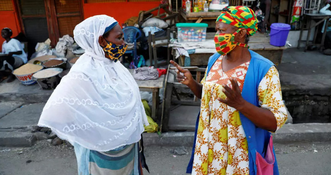 Hai phụ nữ trò chuyện tại một khu chợ ở thành phố Accra, Ghana, hôm 20/4, sau khi lệnh phong tỏa được nới lỏng. Ảnh: Reuters