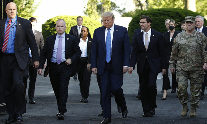 Tổng thống Trump (thứ ba từ phải) cùng Bộ trưởng Quốc Phòng Esper (thứ hai từ phải) và Tướng Milley (ngoài cùng bên phải) rời Nhà Trắng để tới nhà thờ St. John hôm 1/6. Ảnh: AP.