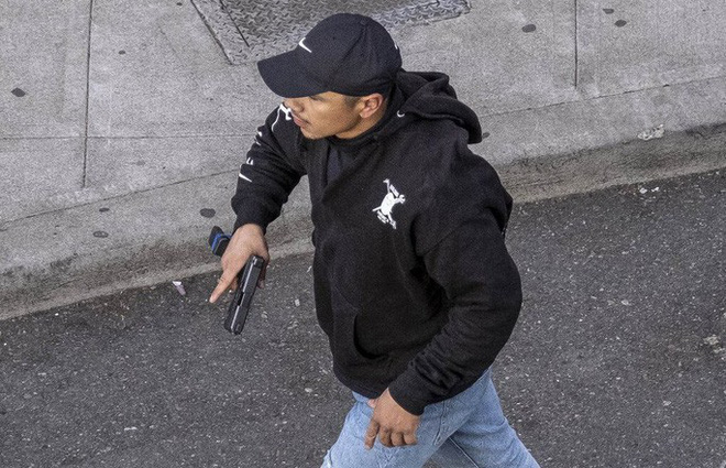 Nghi phạm cầm súng lục ra khỏi xe. Ảnh: The Seattle Times