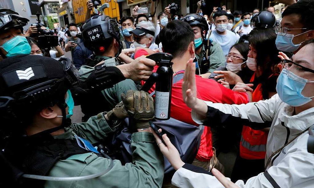 Cảnh sát chống bạo động đối đầu với người biểu tình Hong Kong, ngày 27/5. Ảnh: Reuters.
