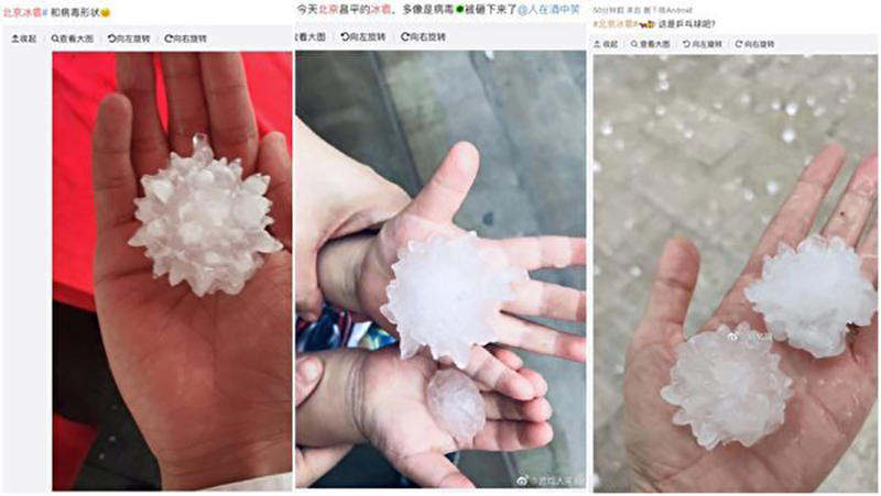 Trong dịp tết Đoan Ngọ 25/6 vừa qua, người dân Bắc Kinh chứng kiến trời trút mưa đá , nhiều người chụp ảnh post lên Weibo, cũng không ngừng kêu la rằng mưa đá to như quả trứng và bề ngoài của nó giống hệt virus Vũ Hán. Cũng trong ngày hôm đó, nhiều khu vực ở phía Nam và phía Bắc Trung Quốc phải đối mặt với mưa lớn và lũ quét nghiêm trọng.