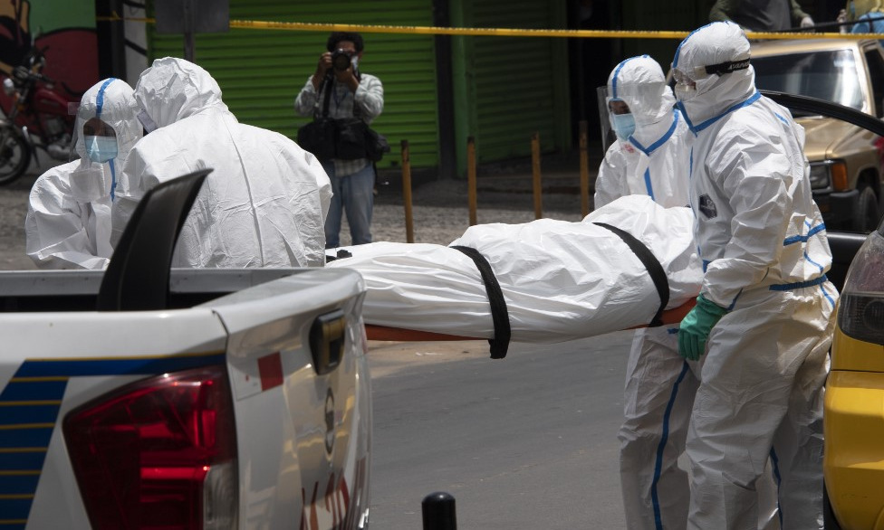 Nhân viên y tế xử lư xác một người chết trên đường tới bệnh viện ở El Salvador hôm 29/6. Ảnh: AFP.