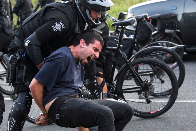 Một người biểu tình bị cảnh sát Seattle bắt giữ. Ảnh: AP.