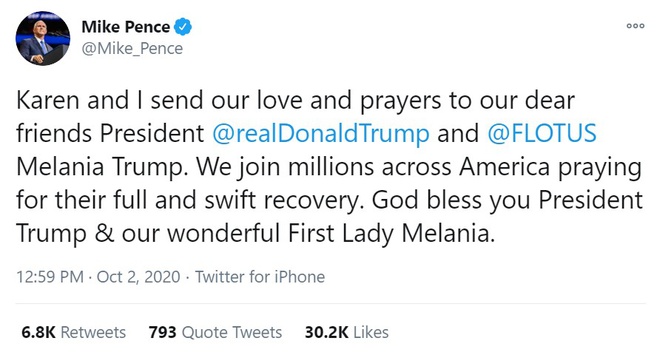 Phó tổng thống Mỹ Mike Pence mong tổng thống và vợ mau khỏe lại. Ảnh: Twitter.
