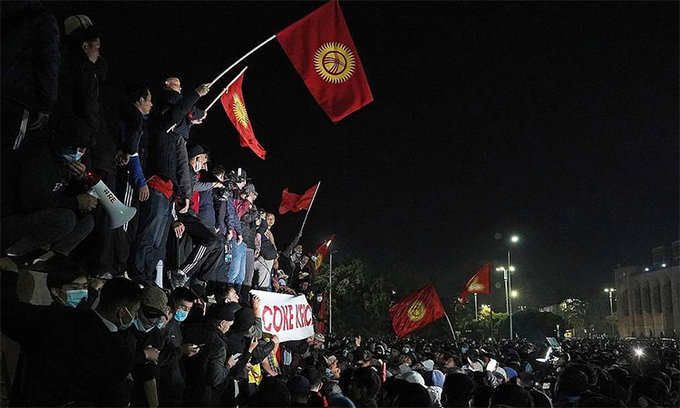 Biểu tình tại thủ đô Bishkek của Kyrgyzstan nổ ra sau cuộc bầu cử quốc hội hôm 4/10, với 16 đảng tham gia tranh 120 ghế trong quốc hội. Theo kết quả kiểm phiếu sơ bộ, chỉ 4 đảng đạt tối thiểu 7% số phiếu để vào quốc hội, khiến các đảng khác phản đối.
