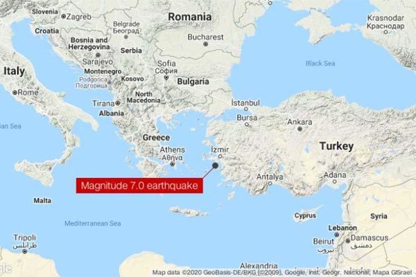 Theo Cơ quan khảo sát địa chất Mỹ (USGS), tâm chấn của động đất cách bờ biển Izmir (Thổ Nhĩ Kỳ) 17km và cách thị trấn Néon Karlovásion trên hòn đảo Somos của Hy Lạp khoảng 14km về phía đông bắc, ở độ sâu chỉ 10km.