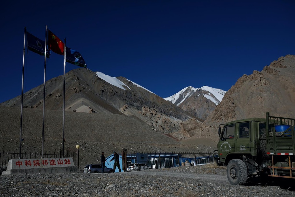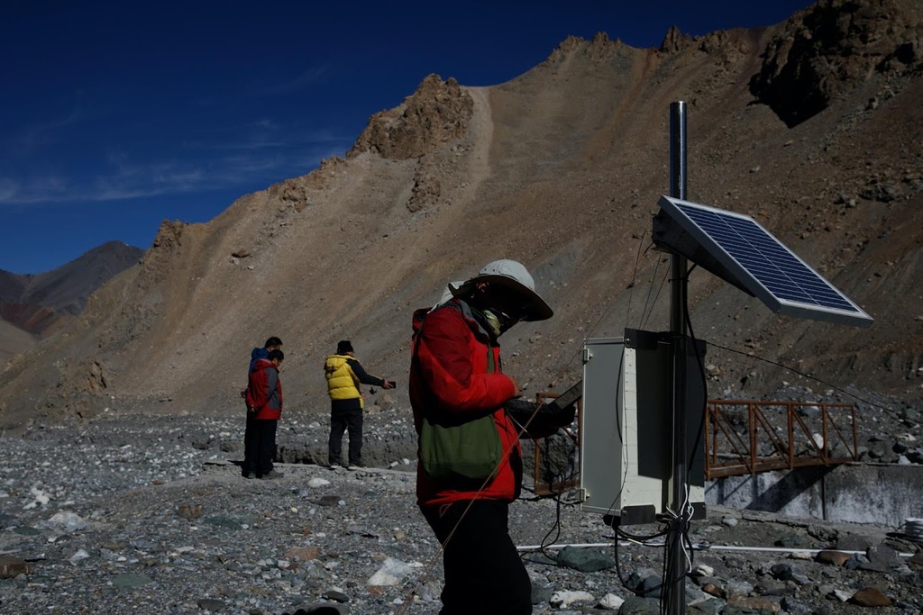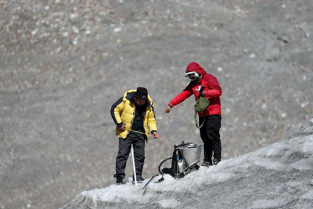 Ông Qin Xiang, Giám đốc trạm quan sát trên đỉnh Kỳ Liên, cùng với Jin Zizhen, một nghiên cứu sinh tiến sĩ về thủy văn từ băng, đang đo đạc các chỉ số tại phần rìa của sông băng Laohuguo.