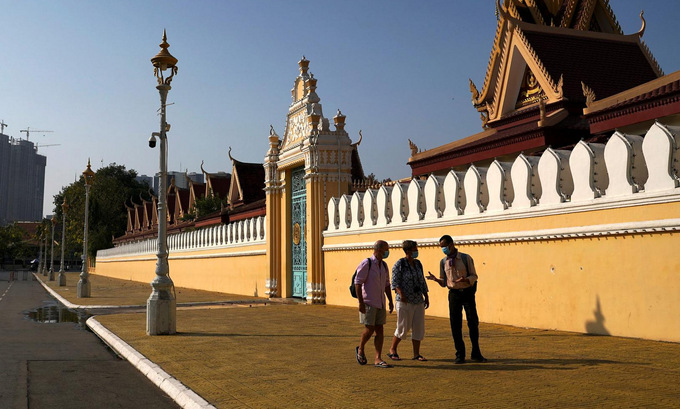 Du khách bên ngoài Cung điện Hoàng gia Campuchia hồi tháng 3. Ảnh: Reuters.