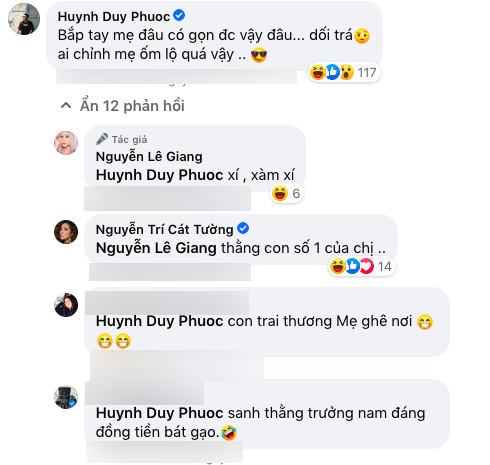 Khi mọi người dành nhiều lời ngỡ ngàng khi quý tử nhà nữ nghệ sĩ lại nhiệt tình trêu ghẹo mẹ. Cụ thể, Duy Phước soi chi tiết: "Bắp tay mẹ đâu có gọn được vậy đâu, dối trá. Ai chỉnh mẹ ốm lộ quá vậy". Ngay lúc này đây mọi người cũng một phen cười ngất vì chính người nhà công khai tiết lộ chuyện mẹ nhờ công cụ chỉnh sửa ảnh để khác xa thực tế.