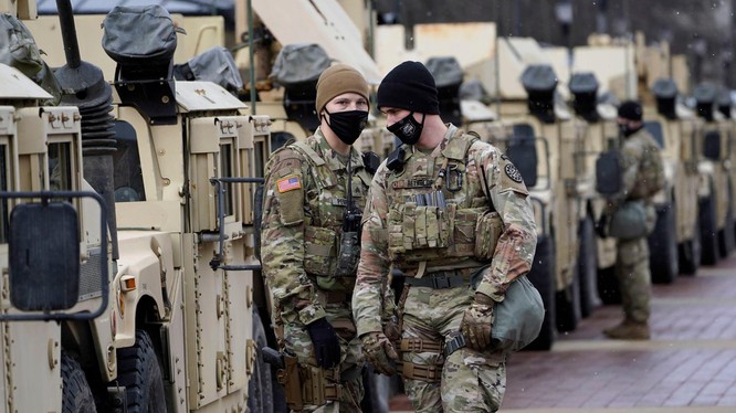 Cục Điều tra Liên bang Mỹ (FBI) gần đây đã đưa ra cảnh báo rằng “các cuộc biểu tình có vũ trang” có thể nổ ra ở 50 bang và Washington, DC; đồng thời chính quyền và các cơ quan thực thi pháp luật các địa phương đã duy trì mức độ cảnh giác cao. FBI cho biết họ đã nhận được cảnh báo rằng trong thời gian từ ngày 16/1 đến lễ nhậm chức của tổng thống ngày 20/1, "các cuộc biểu tình vũ trang" có thể nổ ra tại thủ phủ của 50 bang và Điện Capitol ở Washington, DC. Trong ảnh, hôm 17/1, các thành viên của Vệ binh Quốc gia bang Michigan đứng bên ngoài Tòa nhà nghị viện làm nhiệm vụ.