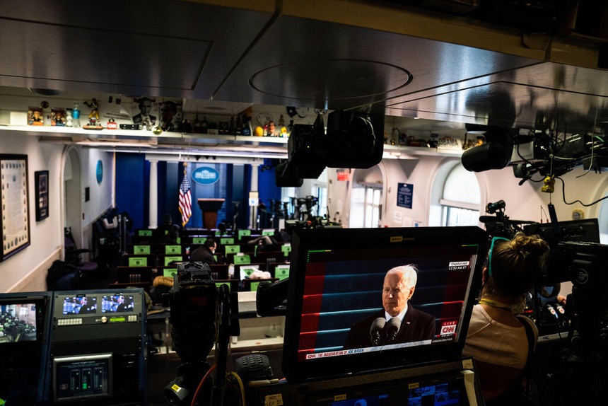 Phòng họp báo Nhà Trắng trong lúc buổi lễ nhậm chức của ông Biden diễn ra. Ảnh: New York Times.