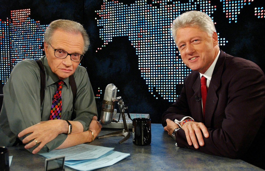 Ông Larry King tṛ chuyện cùng cựu Tổng thống Mỹ Bill Clinton trên CNN ở New York vào ngày 3/9/2002. Ảnh: Reuters.