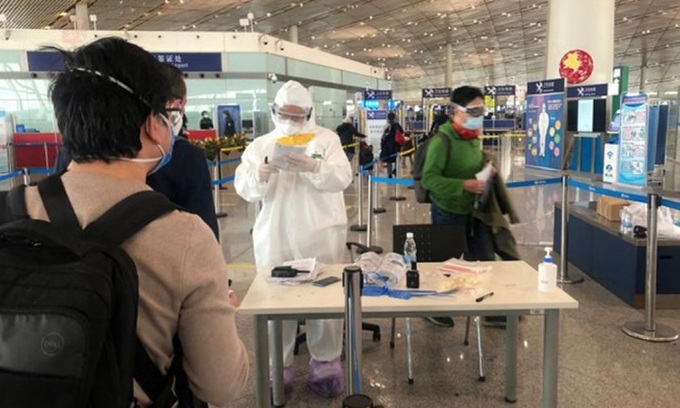 Hành khách xếp hàng nộp khai báo y tế tại một sân bay ở Bắc Kinh, Trung Quốc tháng 3/2020. Ảnh: Global Times.