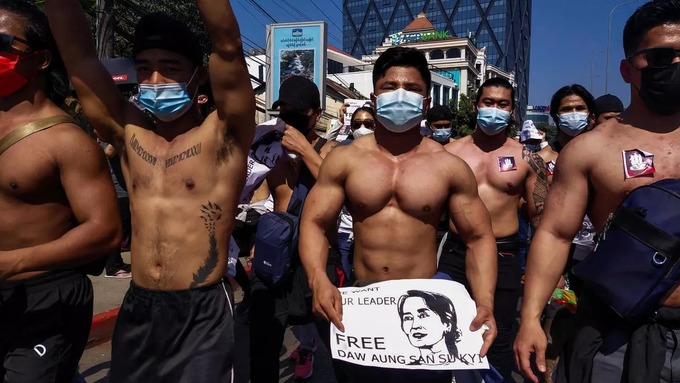 Nhiều người mặc trang phục bắt mắt, trong khi một số người đàn ông cởi trần khoe cơ bắp khi biểu tình yêu cầu quân đội Myanmar thả Aung San Suu Kyi.