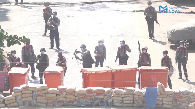 Cảnh sát làm nhiệm vụ tai một địa điểm ở Yangon, Myanmar ngày 3/3. (Ảnh: Reuters)