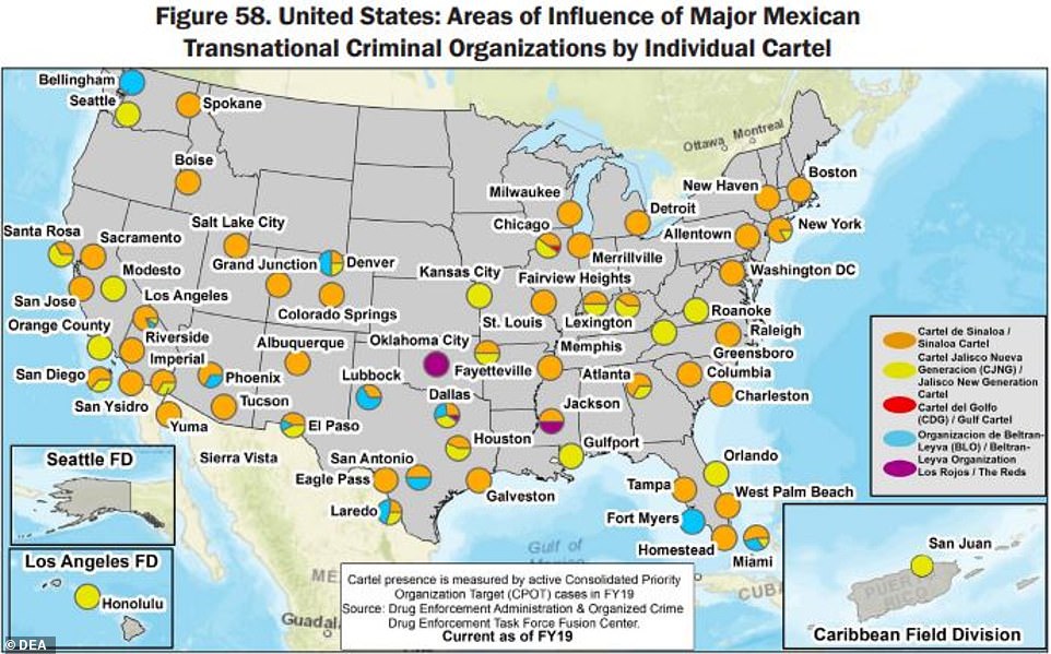 DEA cũng công bố tấm bản đồ nước Mỹ, cho thấy những khu vực nào đang chịu sự ảnh hưởng của các băng đảng ma túy Mexico.