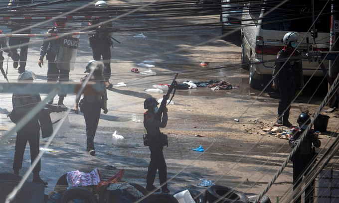 Lực lượng an ninh trấn áp người biểu tình chống đảo chính tại Yangon, Myanmar, hôm 4/3. Ảnh: Reuters.