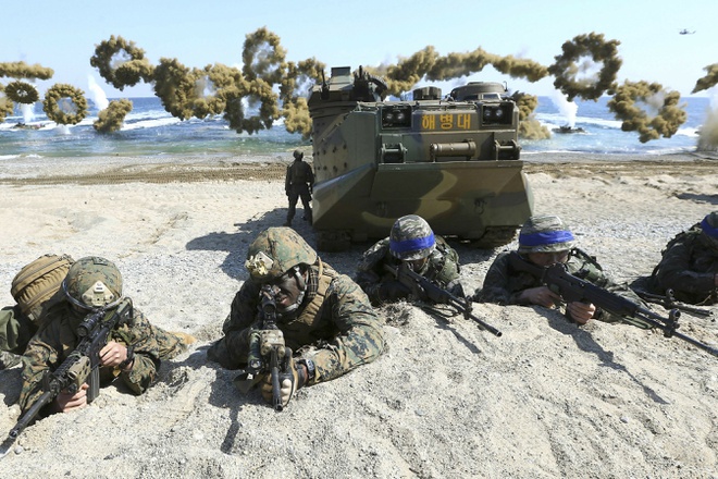Lính thủy quân lục chiến Mỹ và Hàn Quốc tập trận bắn đạn thật vào năm 2016. Ảnh: AP.