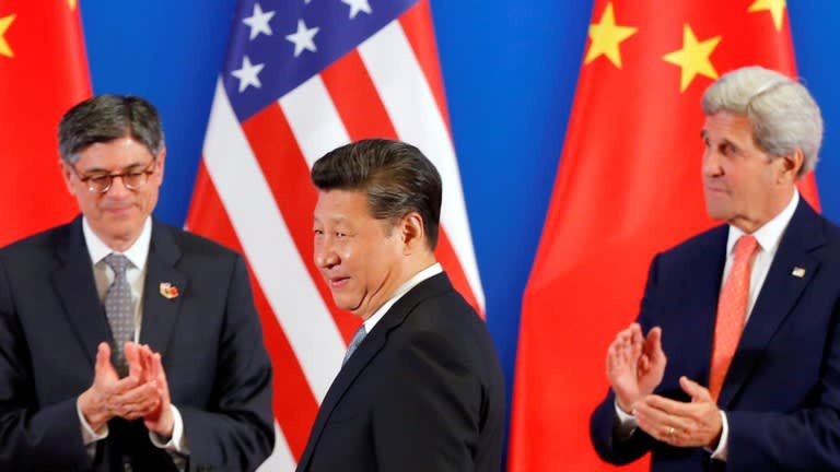 Chủ tịch Trung Quốc Tập Cận Bình (giữa) và Ngoại trưởng Mỹ John Kerry (bên phải) trong lễ khai mạc Đối thoại Chiến lược và Kinh tế Mỹ - Trung tại Bắc Kinh năm 2016. Ảnh: Reuters.