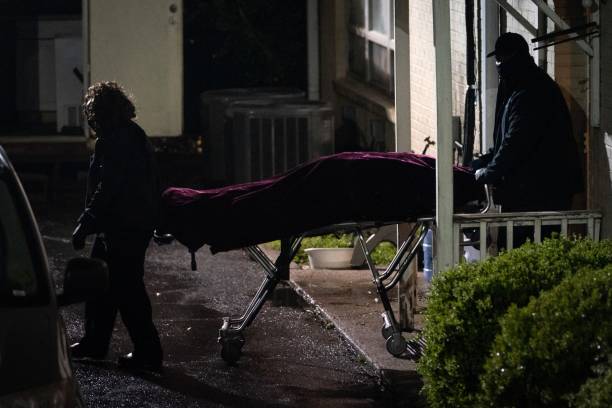 Một xác người được mang ra ngoài tiệm Gold Spa đêm thứ Ba, 16 tháng 3, 2021. (Elijah Nouvelage/ AFP via Getty Images)