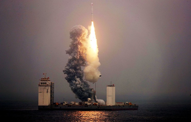 Tên lửa Trường Chinh 11 của Trung Quốc rời bệ phóng trên biển Hoàng Hải vào tháng 6/2019 để đưa 7 vệ tinh vào quỹ đạo (Ảnh: Reuters).