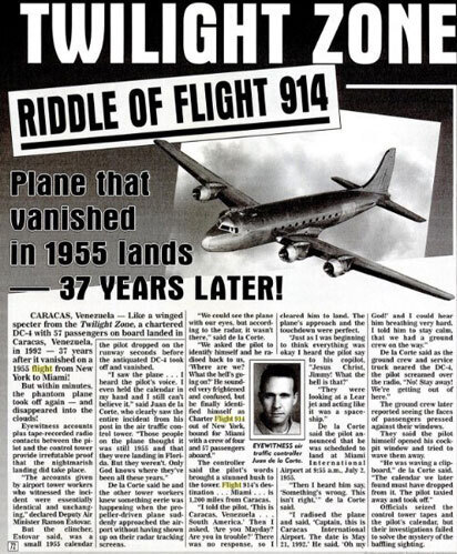 Theo ********* dịch tin, một chiếc máy bay mang số hiệu 914, cất cánh từ New York tới Miami vào năm 1955 đã bất ngờ xuất hiện ở Venezuela năm 1992. Đáng nói, khi hỏi phi cơ và các hành khách trên chuyến bay, họ lại nói như thể chỉ mới trên bầu trời vài giờ chứ không phải là 37 năm.