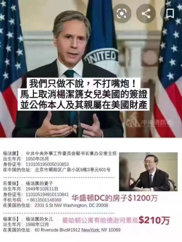 Địa chỉ của vợ và con gái của Dương Khiết Trì ở Hoa Kỳ đang lan truyền trên mạng (Ảnh dẫn theo ntdtv.com)