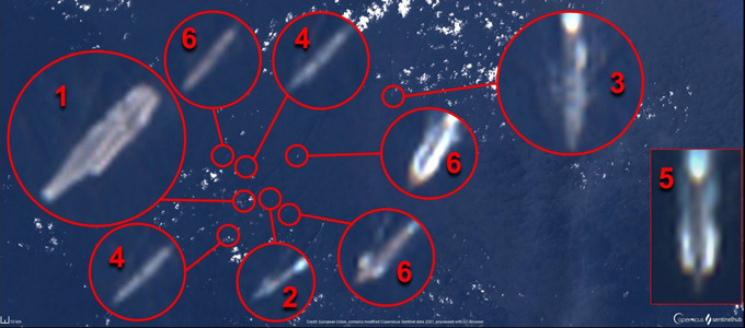 Tàu Trung Quốc (đánh số 1-5) và ba tàu khu trục Mỹ trên Biển Đông hôm 16/4. Ảnh: Twitter/OSINT-1.