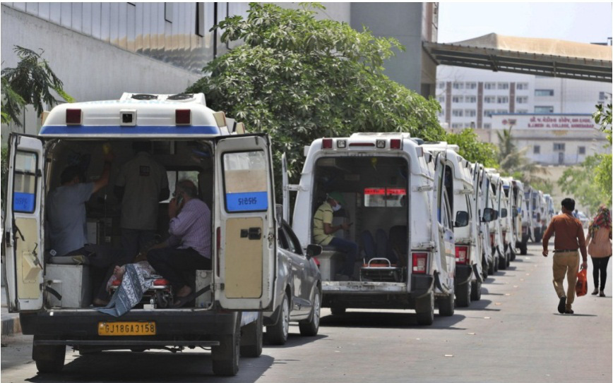 Xe cấp cứu chở bệnh nhân COVID-19 xếp hàng dài trước một bệnh viện được chỉ định ở Ahmedabad, Ấn Độ vào ngày 22/4.