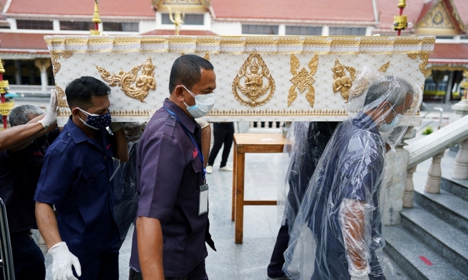 Quan tài chứa thi thể bệnh nhân Covid-19 được chuyển tới một ngôi đền ở thủ đô Bangkok, Thái Lan, hôm 24/4. Ảnh: Reuters.