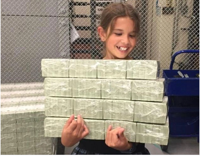 Trong chuyến tham quan Kho bạc Mỹ ở Washington, Kai thậm chí được cầm trên tay rất nhiều tiền. Donald Trump Jr. nói đùa rằng con gái tận hưởng khoảnh khắc “hơi phô trương” này, song đó được cho là điều rất bình thường so với khối tài sản lớn của gia đình này. Ảnh: @donaldTrumpJr.