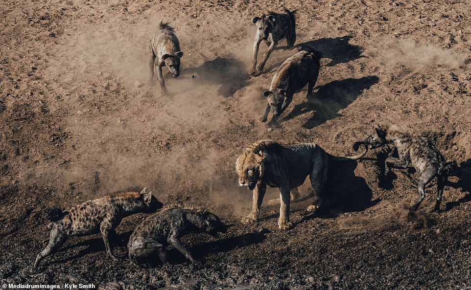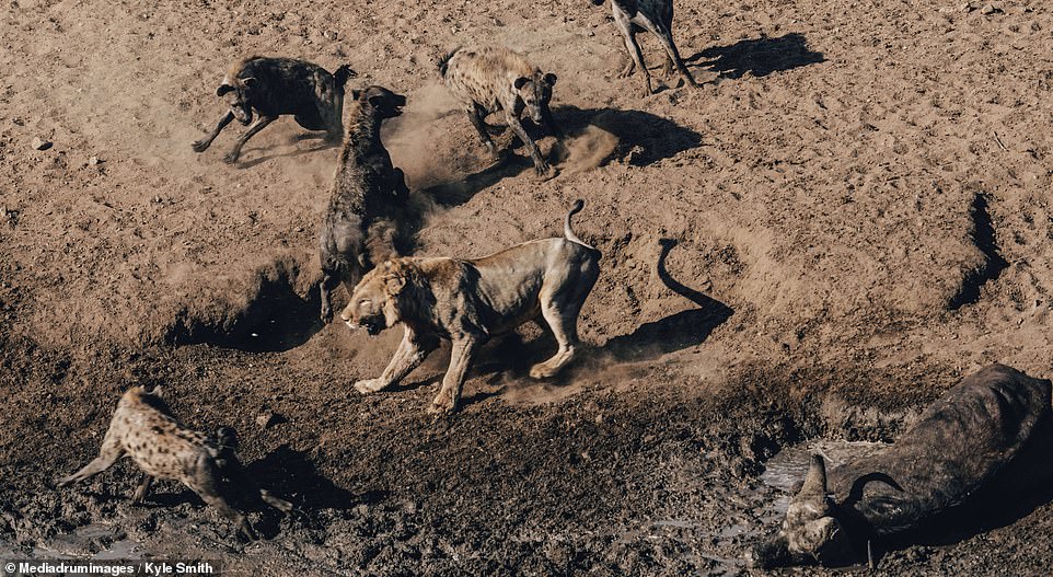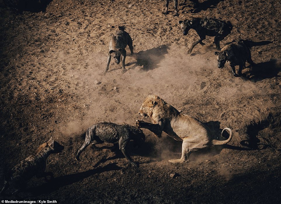 Trong một bức ảnh, con linh cẩu nặng 60kg cắn mạnh vào phía sau sư tử. Con sư tử tỏ ra không hề hấn gì. Trong một bức ảnh khác, sư tử nặng 180kg chiếm lấy xác trâu rừng, chứng minh nó mới là kẻ chiến thắng.