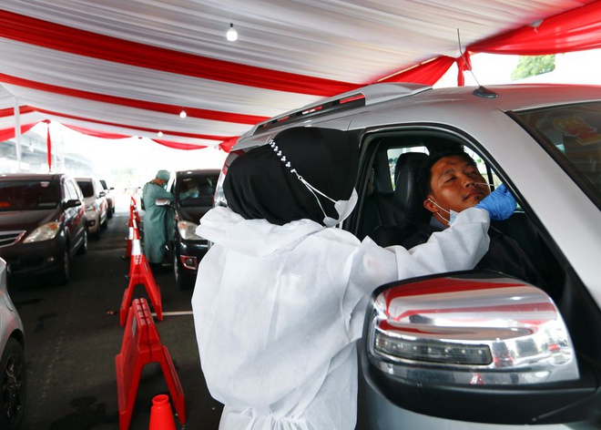 Một nhân viên y tế Indonesia lấy mẫu thử tại chốt kiểm soát. Ảnh: Reuters.