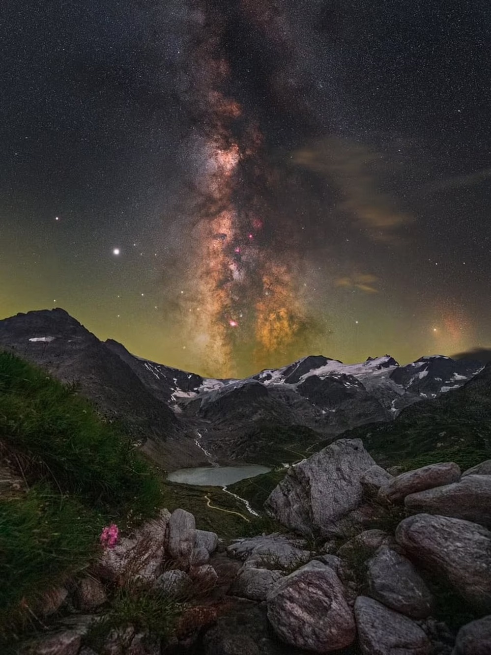 "Hồ Alpine nhỏ bé nằm trên dãy Alps của Thụy Sĩ. Hầu hết thời gian trong năm, khu vực này bị đóng cửa do tuyết. Tôi đã đợi tới khi tuyết tan để lên đường chụp dải Ngân Hà. Thời điểm chụp lý tưởng nhất là vào đầu năm, vì lúc đó dải Ngân Hà ẩn hiện sau ngọn núi", nhiếp ảnh gia Benjamin Barakat cho biết.