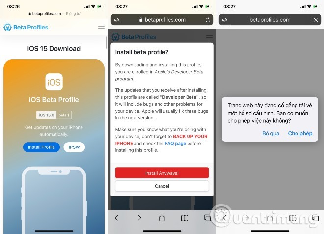 Bước 1: Vào betaprofiles.com/ bằng Safari trên iPhone, hoặc tải profile iOS beta này trên Safari (bỏ qua bước 2)