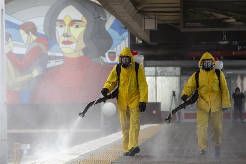 Nhân viên thành phố xịt khử khuẩn tại trạm tàu hỏa ở Moscow, Nga vào ngày 19/5/2020. Ảnh: Tân Hoa Xă.
