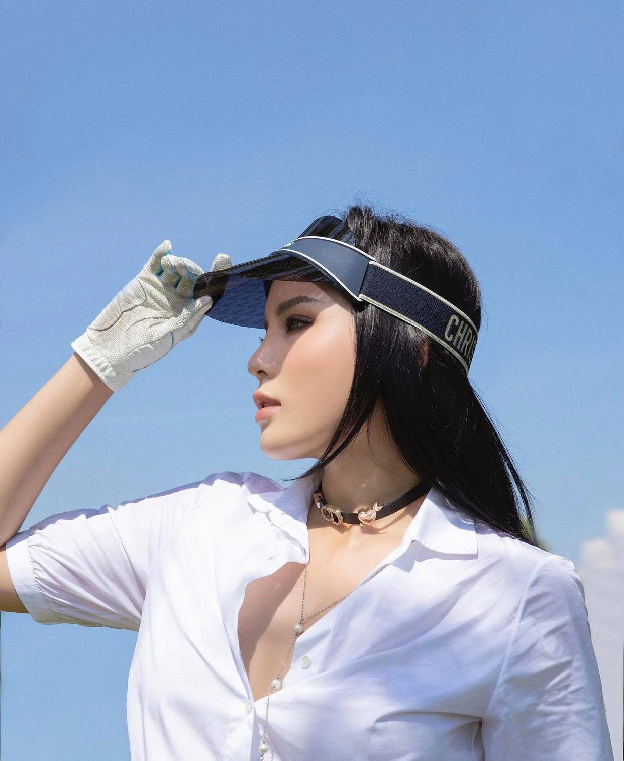 Diện áo sơ mi "buông lơi" vòng 1 trên sân golf, Kỳ Duyên ghi điểm tuyệt đối bởi vẻ ngoài sang trọng, thanh lịch.