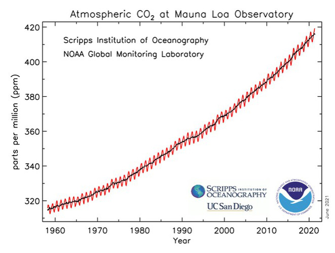 Trong hơn sáu thập kỷ qua, các phép đo CO2 trong khí quyển đã được thực hiện tại Đài quan sát NOAA ở Mauna Loa, Hawaii.