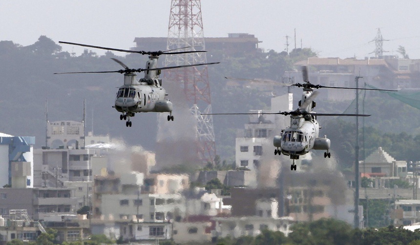 Trực thăng quân sự của Mỹ cất cánh từ căn cứ của Thủy quân lục chiến ở Okinawa, Nhật Bản năm 2012. Ảnh: AP.