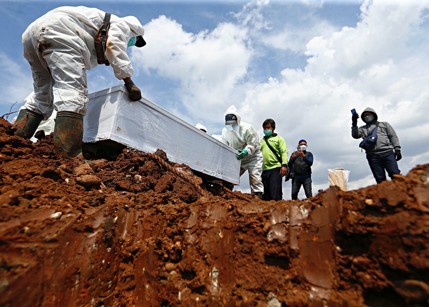 Tại Indonesia, những người đào mộ đang làm việc thâu đêm khi các ca tử vong do Covid-19 không ngừng gia tăng bởi sự thiếu hụt vaccine và oxy y tế.
