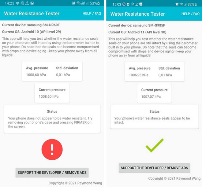 C̣n trong trường hợp ứng dụng trả về kết quả "Your phone's water resistance seals appear to be intact", nghĩa là chức năng chống nước trên smartphone của bạn vẫn c̣n hiệu quả.