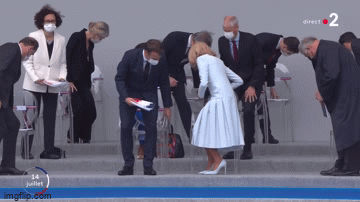 Bên cạnh đó, dù không đeo khẩu trang, Đệ nhất phu nhân Pháp còn vô tư nghiêng người trò chuyện với chồng vi phạm quy định giãn cách an toàn để phòng chống đại dịch Covid-19. Tuy nhiên, đó chưa phải là tất cả. Cộng đồng mạng còn "soi" được hành động kém tinh tế khác của Đệ nhất phu nhân Pháp.